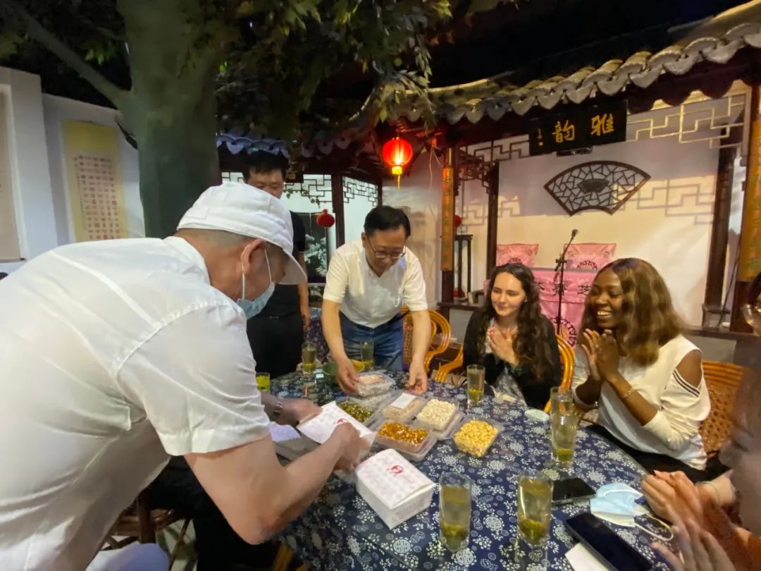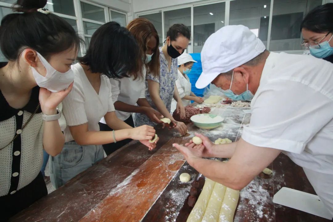 In the pastry making workshop the pastry master of CaizhiZhai revealed some secrets of traditional cake making. He personally guided the foreign students to make Suzhou style cakes such as brewed flower cakes and crisp bean paste cakes. After about half an hour of baking, the students could taste the delicious cakes made by themselves.