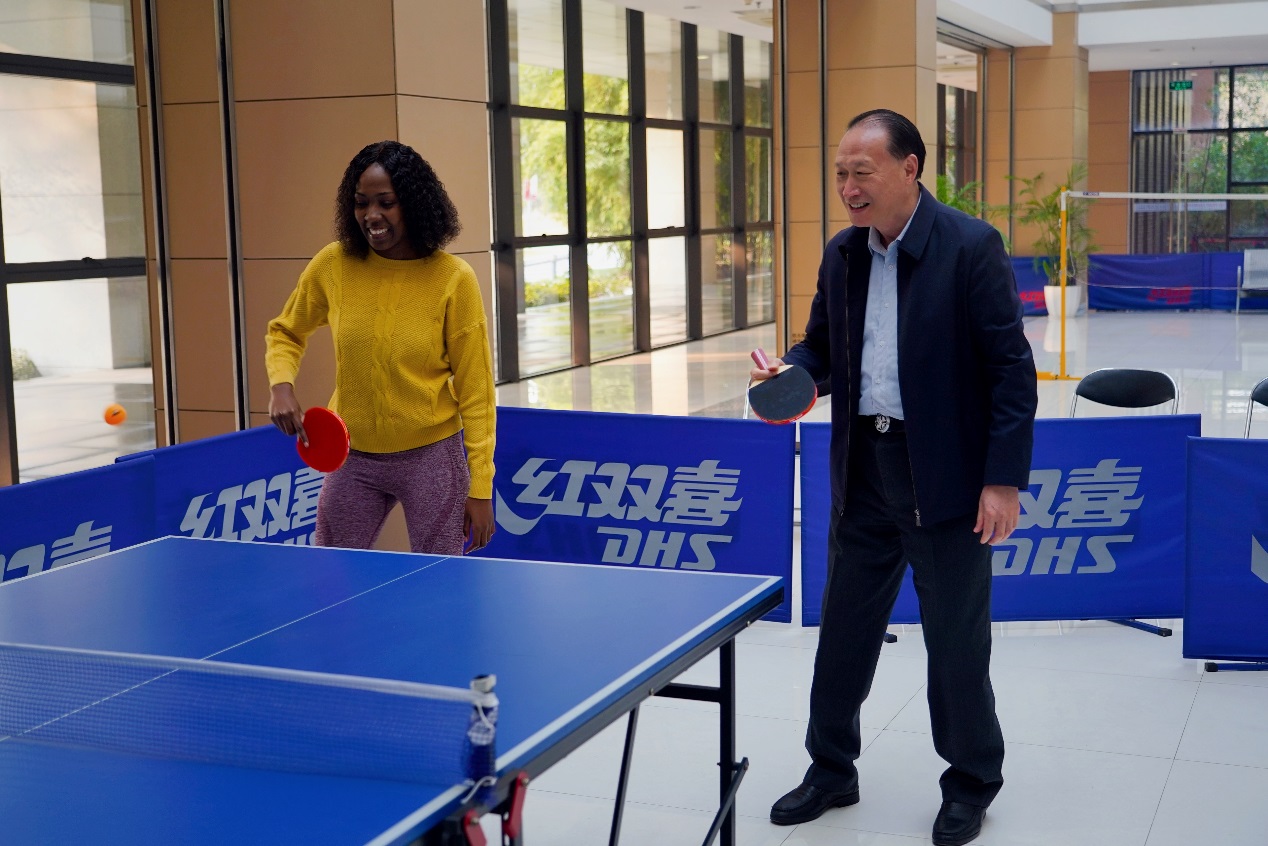 The competition started with Zhang Xuan and Wang Ziwei, national level-2 athletes and members of the table tennis team of Renmin University of China providing guidance and training to foreign students from Dominica, Rwanda, Bangladesh, Nigeria and other countries. The two Chinese students then gave a demonstration performance. With smooth attack and defense conversion in a dynamic game rhythm, they showed the unique charm of table tennis to the foreign students of Silk Road School.