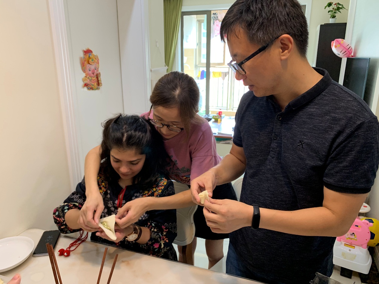 黄紫橙小朋友家为了迎接客人,全家齐聚一堂,家里到处洋溢着浓厚的节日氛围。家庭里的“新成员”巴基斯坦学生Manahil和越南学生Anh也绝不闲着,剥虾、拌馅、包饺子、包馄饨,忙得不亦乐乎。