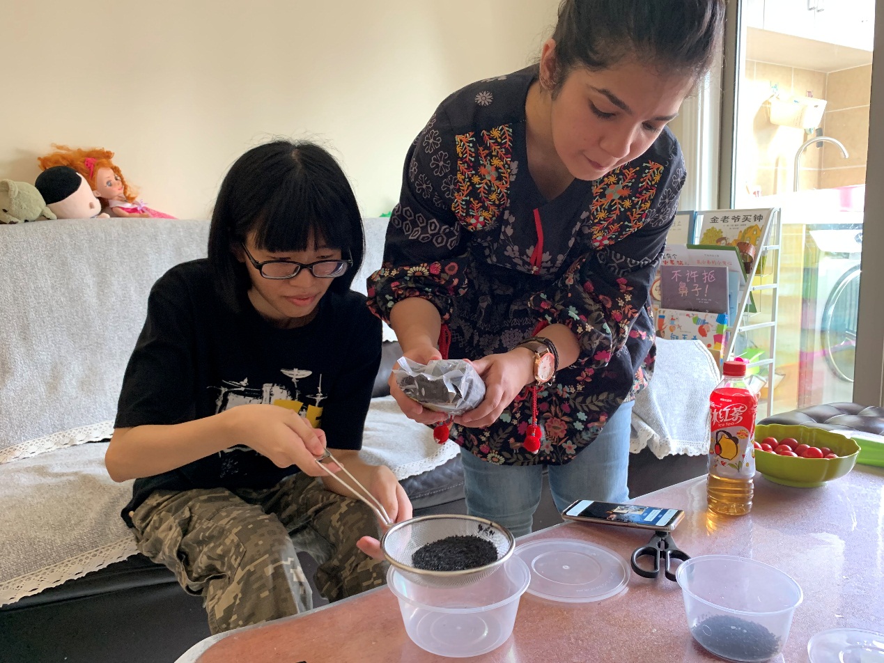 来自印度的Disha和来自哥斯达黎加的Catalina来到了文林萧林工作室,在老师的指导下尝试了古琴弹奏,并一同欣赏了老师与几位琴友的演奏。古琴体验之后,Disha与Catalina还一起尝试学习书写中国书法、品尝中国美食。晚饭时,Disha与Catalina积极加入诗词接力的比赛中,与中国家庭以“月”为主题进行诗歌接力,同时与大家分享了来自印度的歌曲和哥斯达黎加的舞蹈。