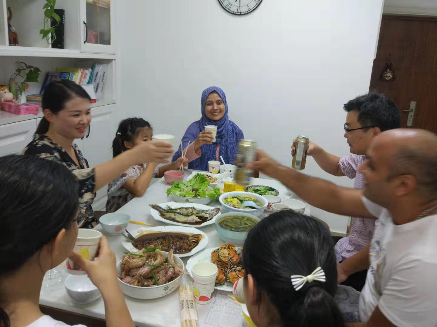 “来年早归喜几多,吃饺话团圆。”吴女士一家每逢佳节都会团聚在一起包饺子,但今年的中秋节对他们来说却与众不同,从妹妹到奶奶,都化身为老师,指导留学生们包饺子。揉面、擀皮、搅馅,每一步都需要足够的耐心,第一次接触饺子制作的留学生Dean与Duyet在吴女士一家的指导下进步飞速,很快就“出师”了。吃着自己包的饺子,望着满桌的苏州传统美食,听着吴女士对美食的精心介绍,留学生们连连称赞:“It's so nice!”