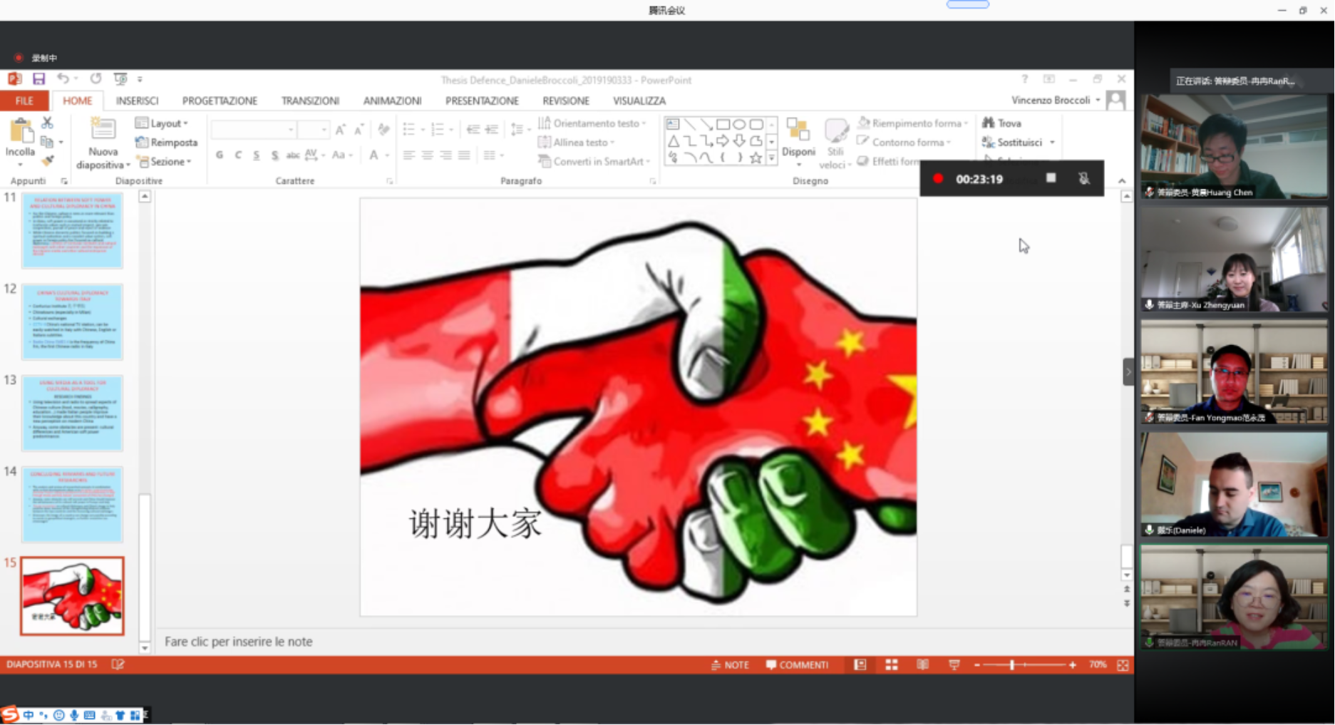 答辩当天,在答辩主席的主持及答辩秘书的协助下,各项工作有条不紊地推进。海外同学通过“屏幕共享”的方式进行答辩,在苏的同学则在现场进行答辩。学生们精心准备自己的研究成果汇报,认真回答老师们的提问;答辩委员们严格把关,对学生们论文的研究主题、研究方法、理论框架以及研究成果等各个方面做了综合点评,以严谨负责的学术态度指出部分论文中存在的问题,并提出详实的修改建议。