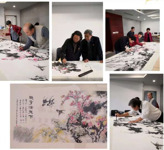 此次书画展展出的作品《桃李满天下》,由胡中元、俞兴宝、周彩宝、倪振人等九位艺术家在色情图 现场合作完成。桃李、迎春、青松、翠竹……各位艺术家将最美好的祝福融入该作品,祝愿色情图 蒸蒸日上,生机无限,桃李满天下。