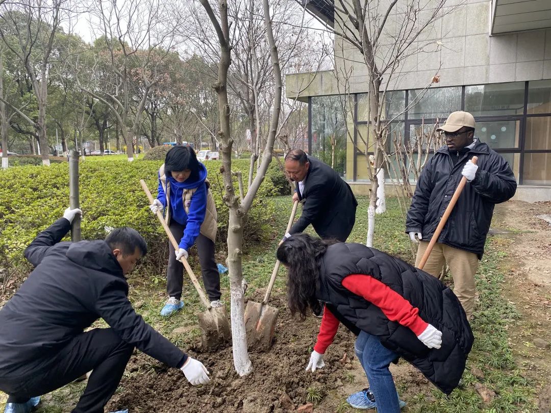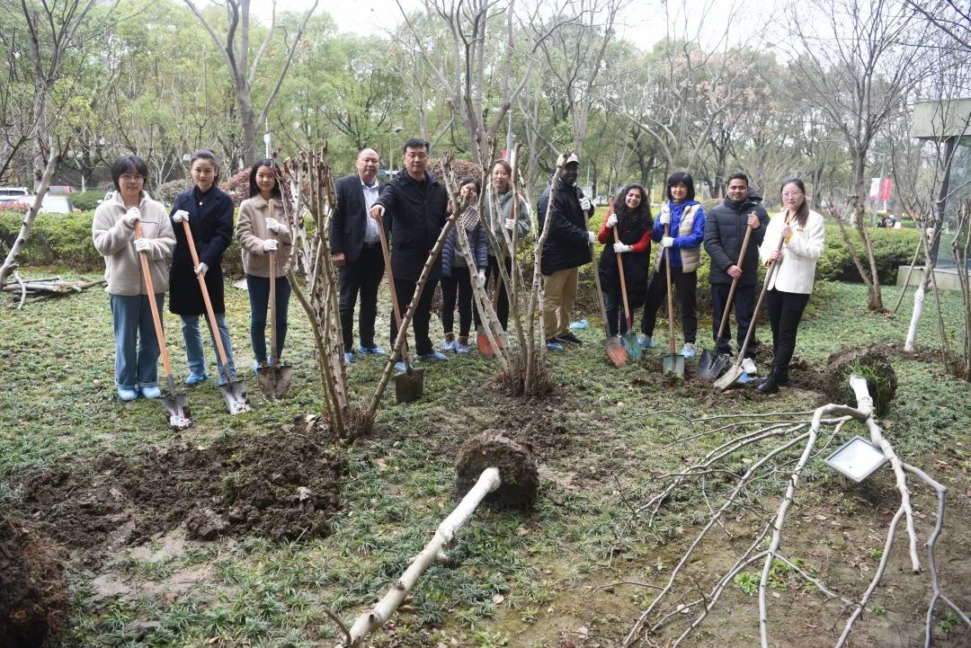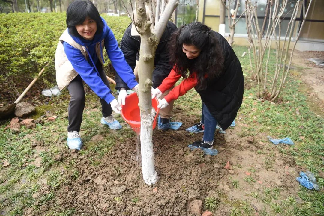 植树现场,大家干劲十足,分工协作,相互配合,三人一组、五人一伙,扶苗、培土、浇灌……大家忙得不亦乐乎,还不时交流彼此对未来的规划以及对加强生态建设、推动绿色发展的看法。在大家的共同努力下,一棵棵生机勃勃的玉兰、紫藤在苏州校区安家落户。
