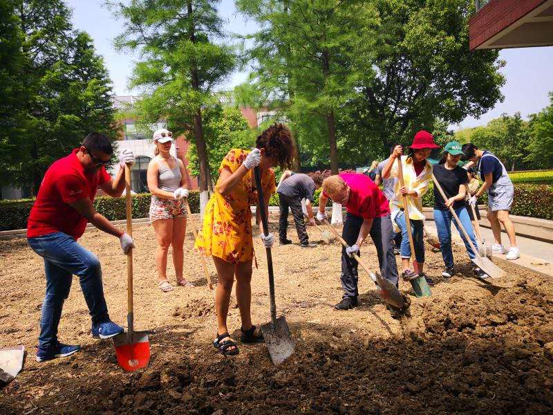 在大家的共同努力下,不一会儿,原本荒芜的土地便露出新土的颜色,仿佛瞬间有了生气。从“丝路花圃”经过的老师、学生纷纷对劳作中的留学生竖起了大拇指。