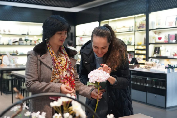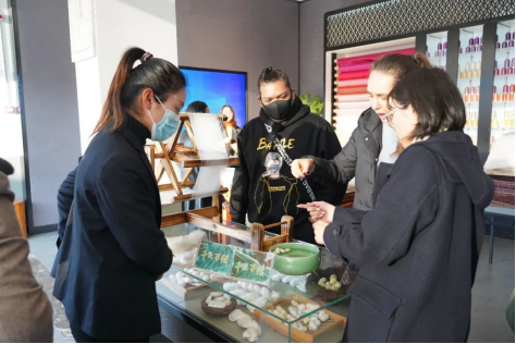 最后,同学们在工作人员带领下来到了太湖雪文创馆。由蚕茧制成的纯手工茧花、口罩、丝巾、发带、手工绣扇等文创产品琳琅满目,精美绝伦。同学们在欣赏文创产品,品尝桑叶茶的欢声笑语中结束了此次参访活动。
