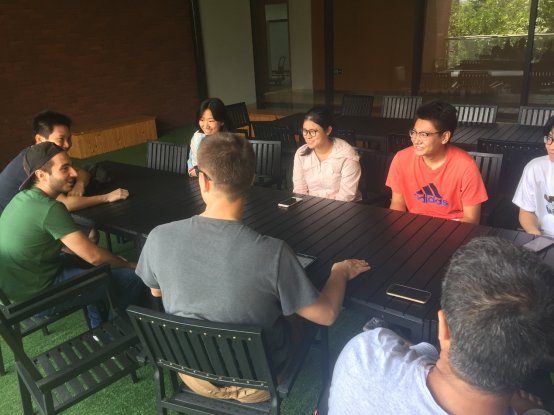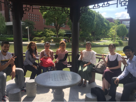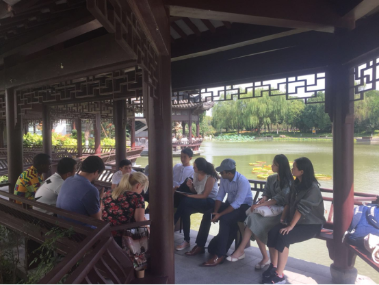 为了让学生们在轻松愉快的环境中表达自己的所思所想,林老师没有将自己的课堂限定在教室:湖畔、走廊、咖啡厅……伴着美景、清风、桂花香,中外学生各抒己见。
